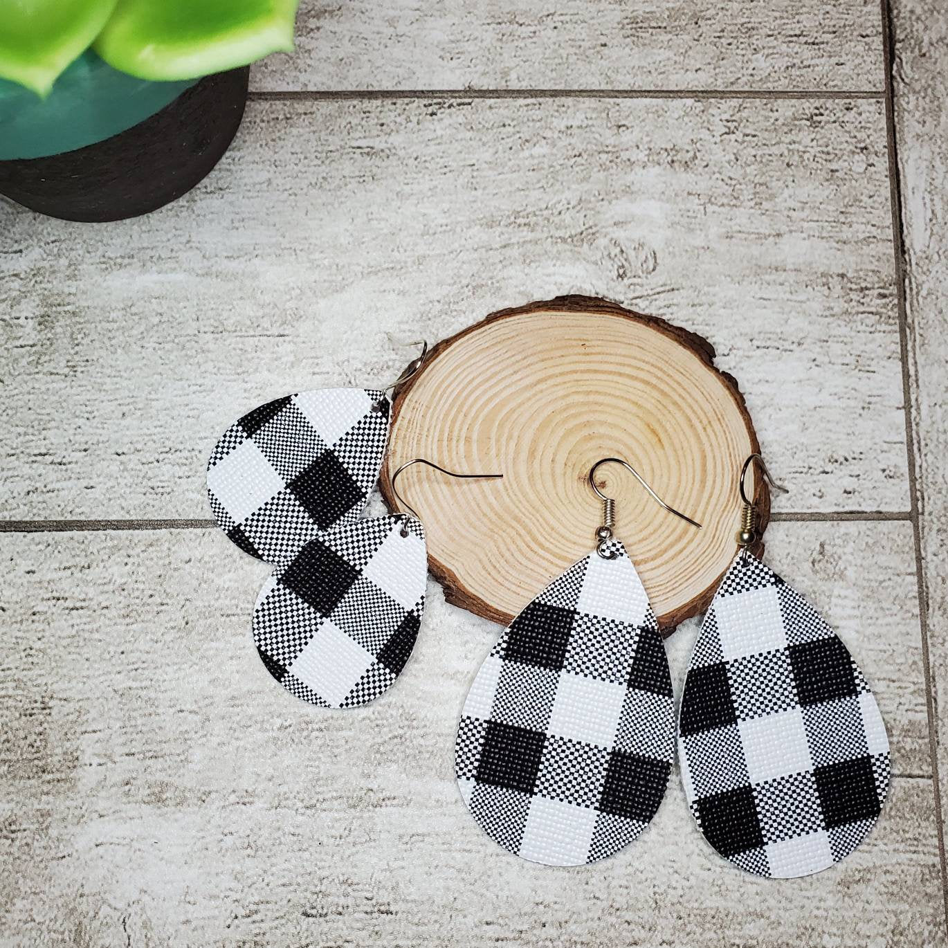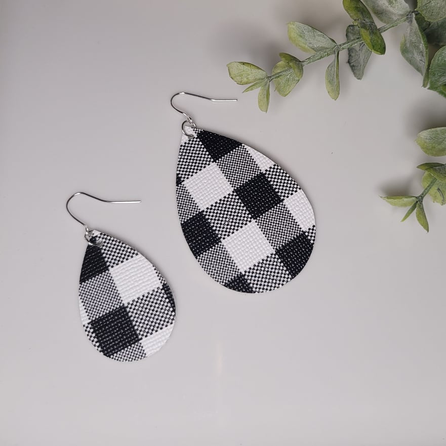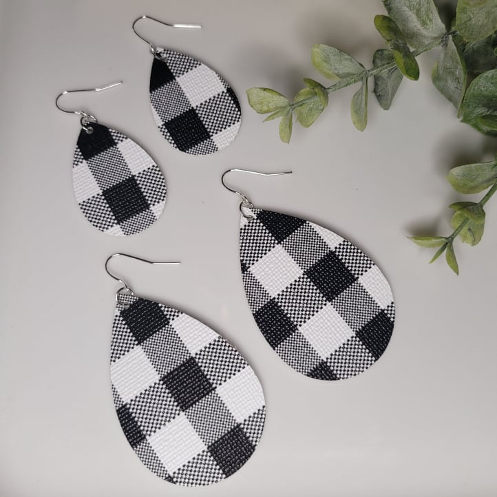 This item is a handcrafted pair of earrings using black and white buffalo plaid faux leatherette in a Teardrop shape. They are weightless, fun and a fashionable accessory to add to any outfit!