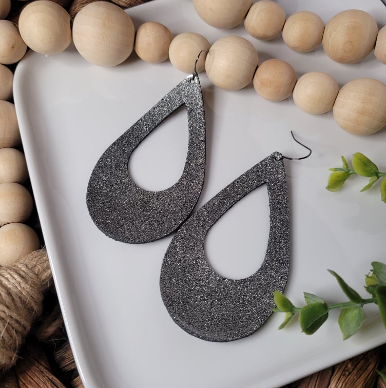 Glamorous Glitter | XLarge Cutout Teardrop | Earring | Gusty Gunmetal | Genuine Leather