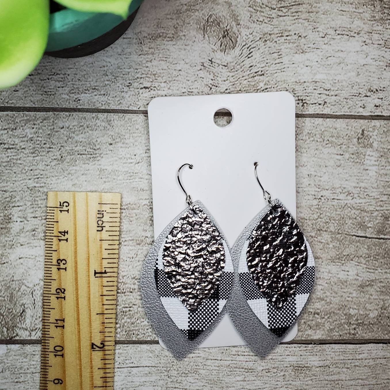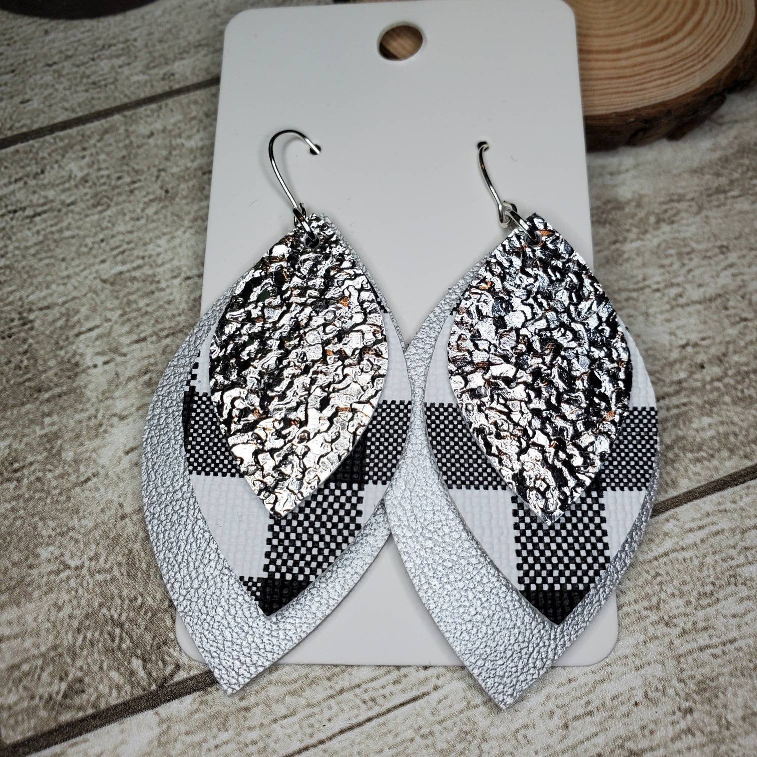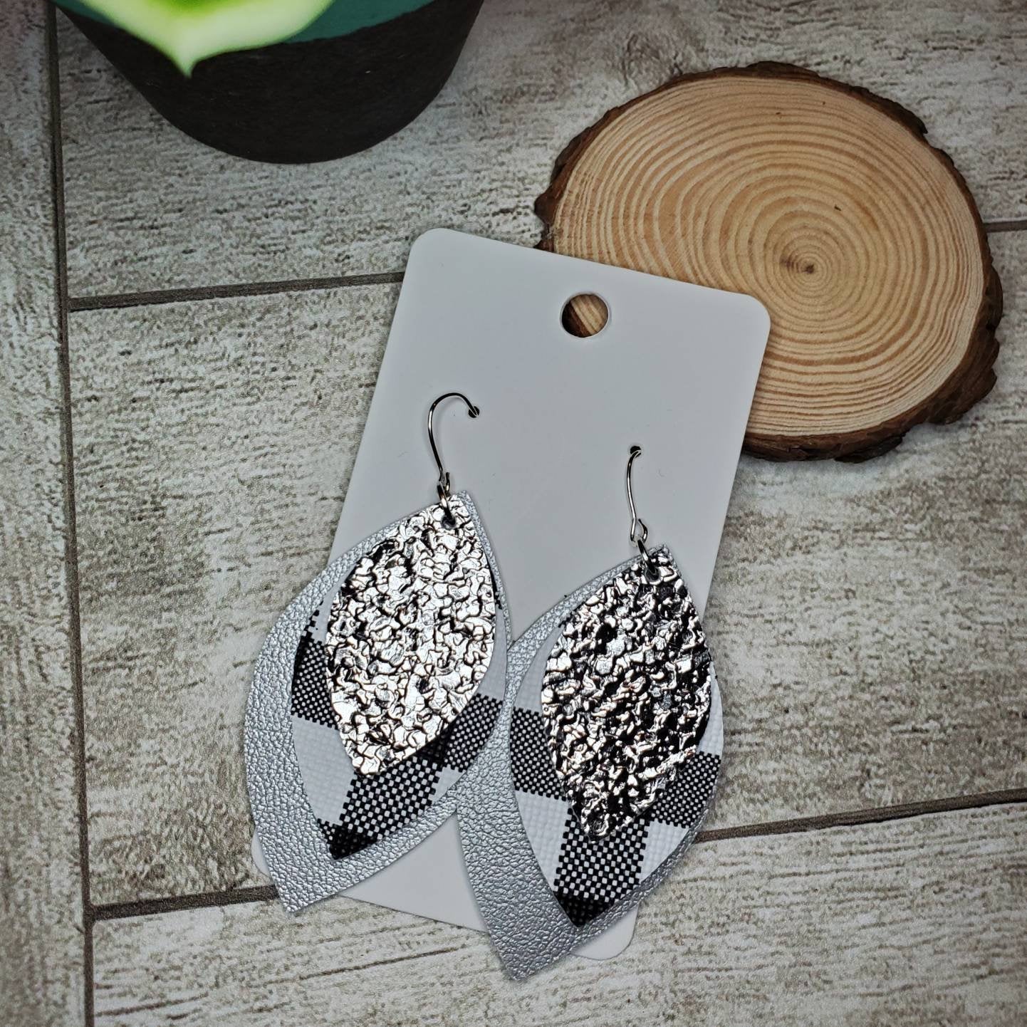 This item is a handcrafted pair of earrings using metallic silver, black & white buffalo plaid faux leatherette layered on a genuine leather silver piece all in leaf layered shapes. They are weightless, fun, and so on trend right now!