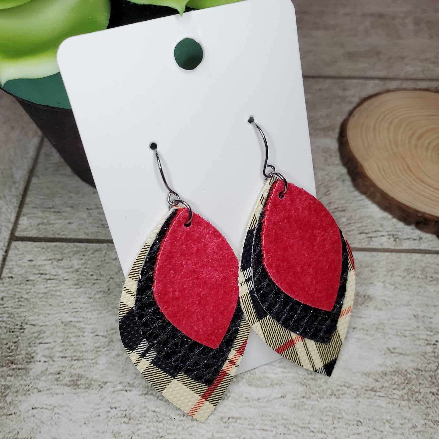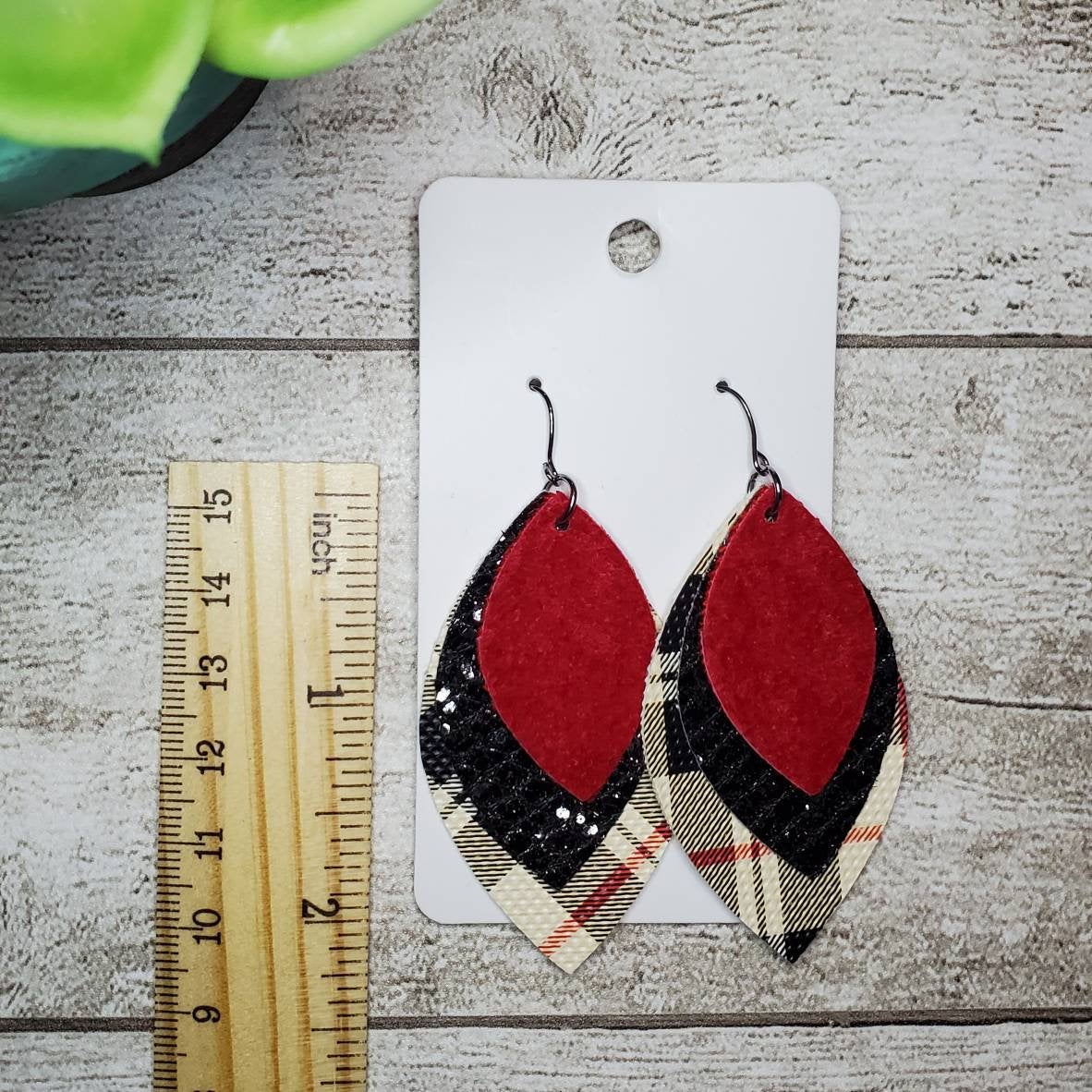 Leaf Layered Earrings | Red velvet, Black Sparkle, Tan, Black & Red Plaid faux leather