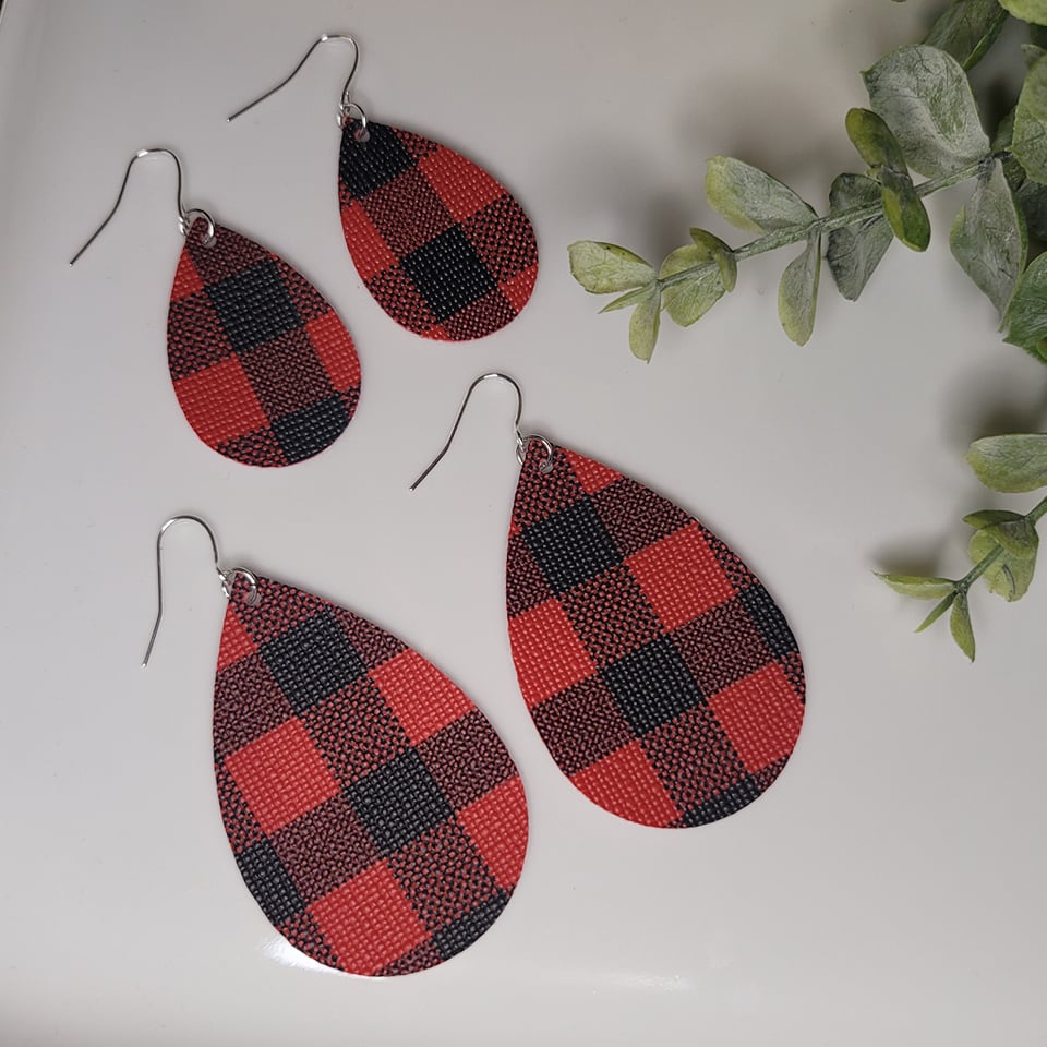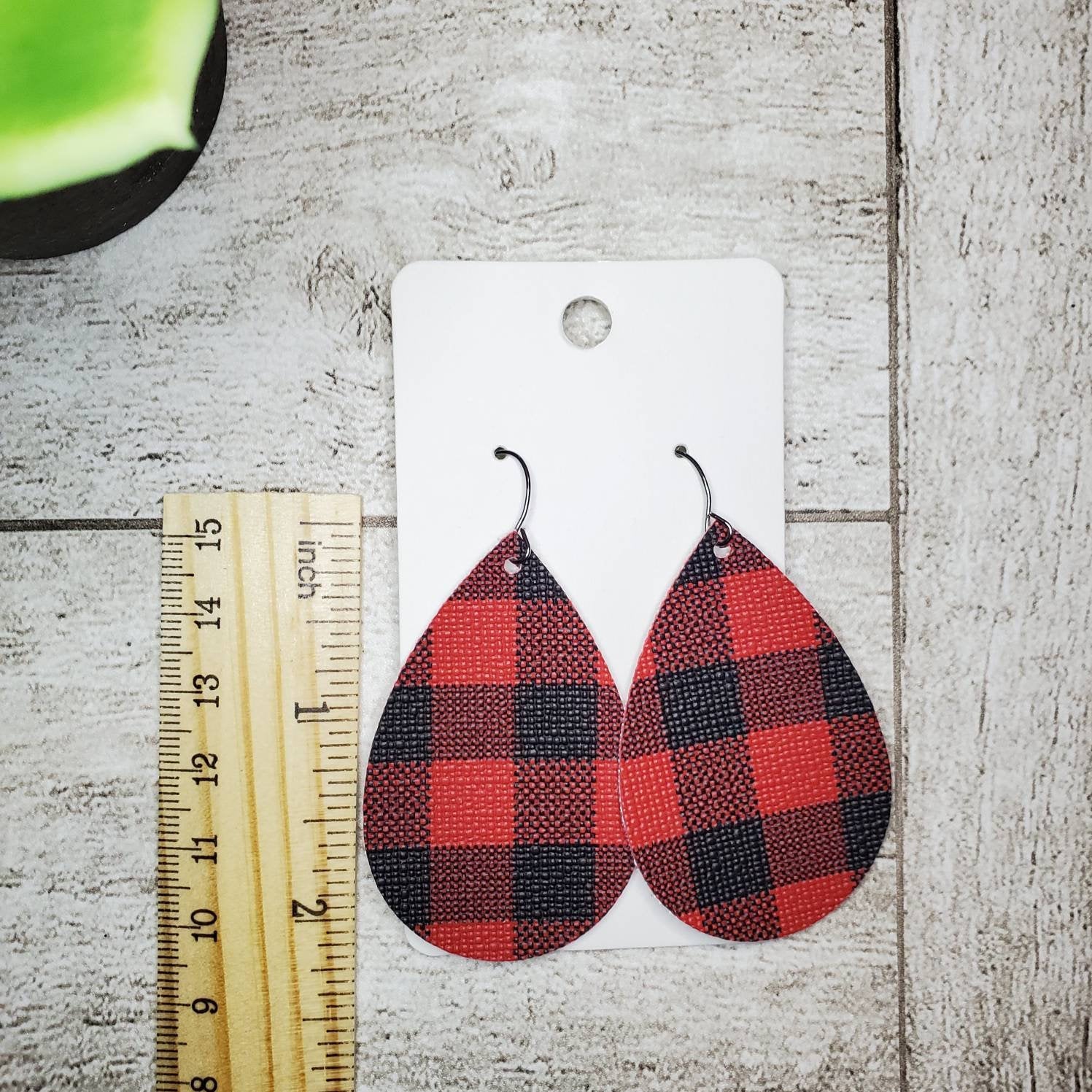 This item is a handcrafted pair of earrings using red and black buffalo plaid faux leatherette in a Teardrop shape. They are weightless, fun and a fashionable accessory to add to any outfit!