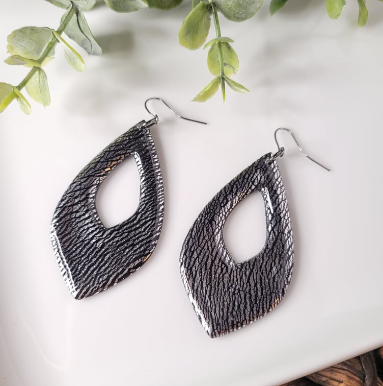 This design was created using a crackle technique, overlaying metal leaf onto the black clay slab then pressing and stretching it. These silver on black pieces can be very versatile with jeans and a tee to finishing off that dress for a night out.