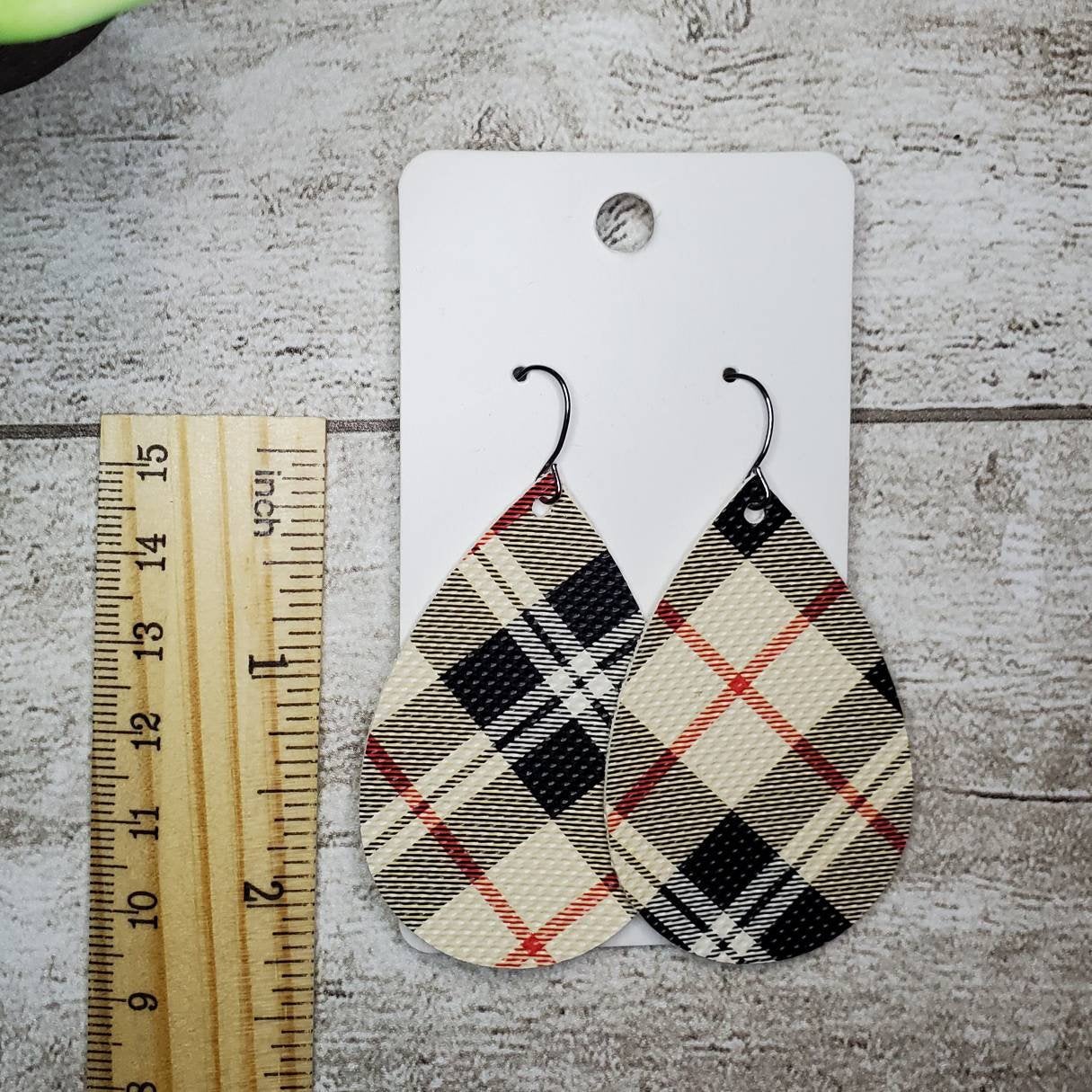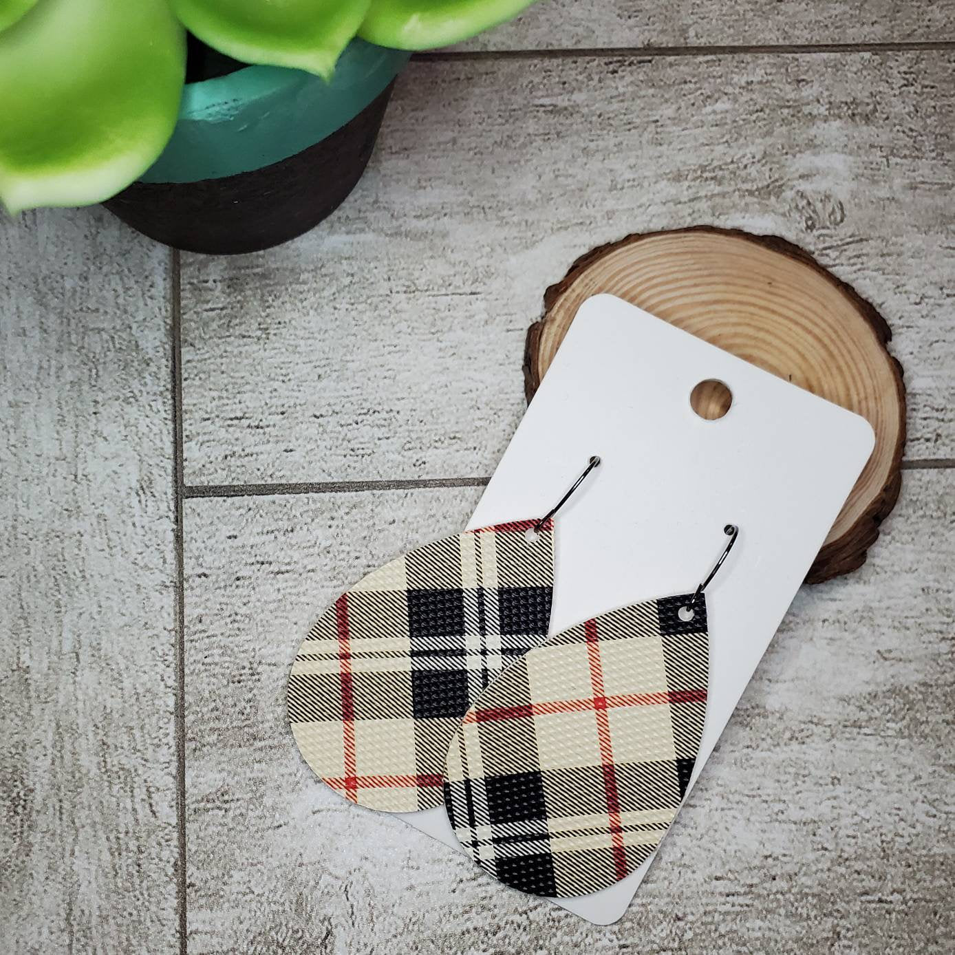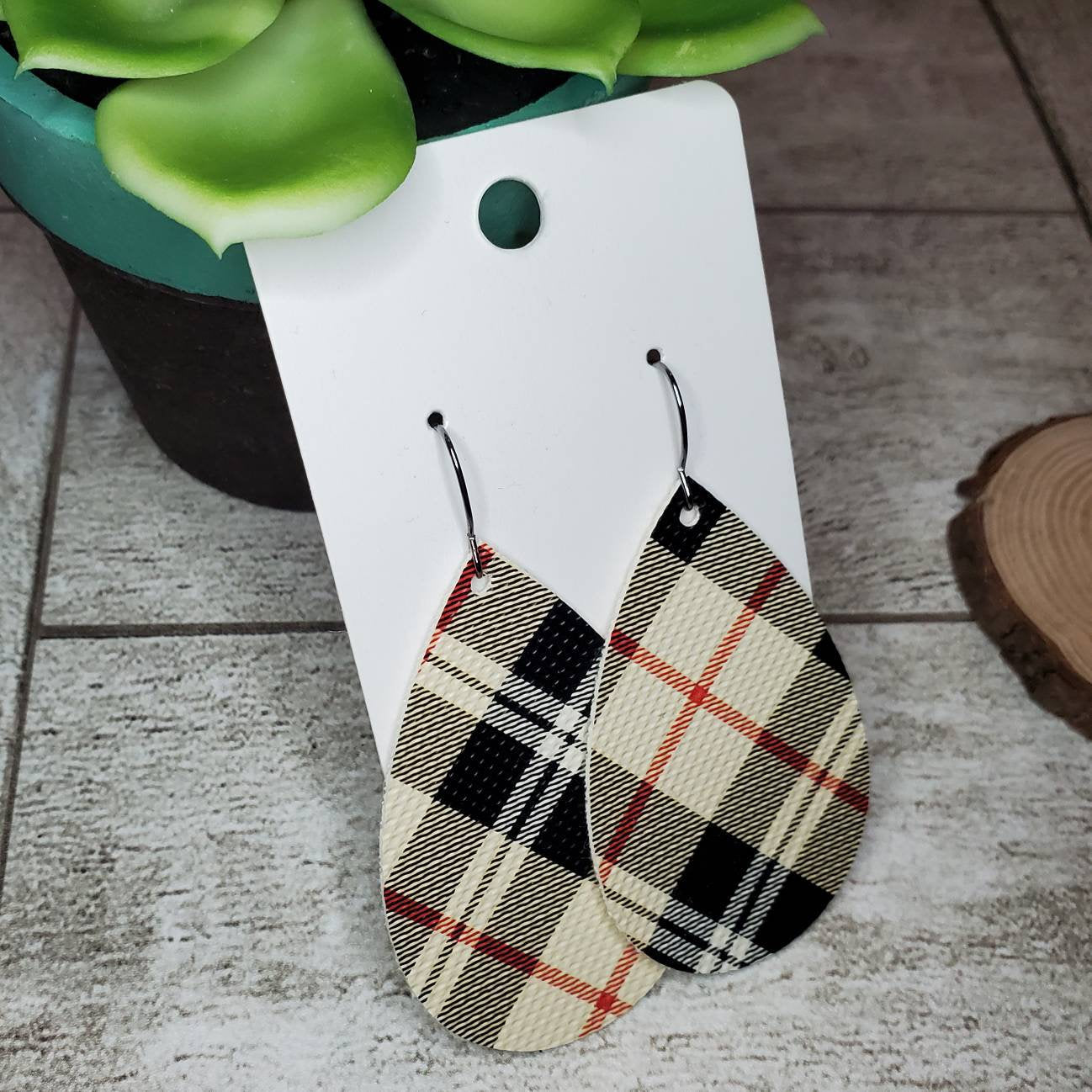 This item is a handcrafted pair of earrings using tan, black and red plaid faux leatherette in a Teardrop shape. They are weightless, fun and a fashionable accessory to add to any outfit!